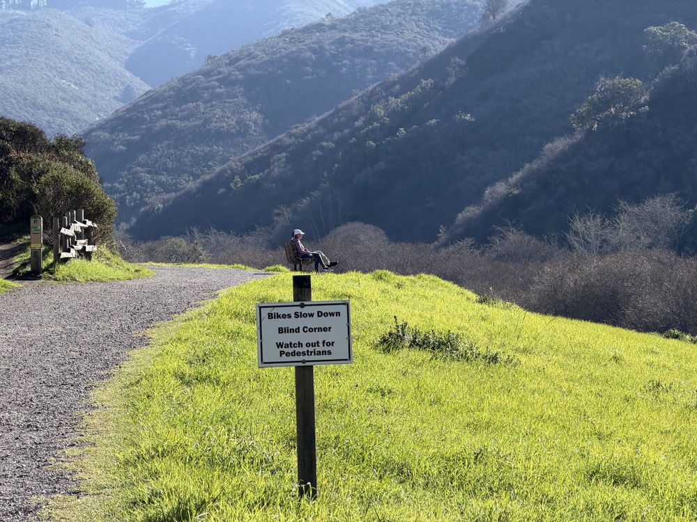 After passing the summit, the trail gently switches back down to the park entrance, leading through a forest of tall eucalyptus trees.