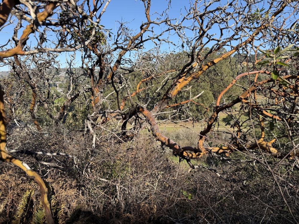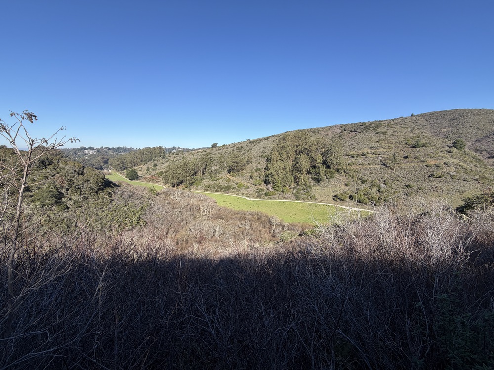 Hazelnut Trail then veers off sharply to the right and leads up the hill on a steep, windy path. On the way up, it offers great views of the park and the ocean at Lindamar Pacifica State Beach.
