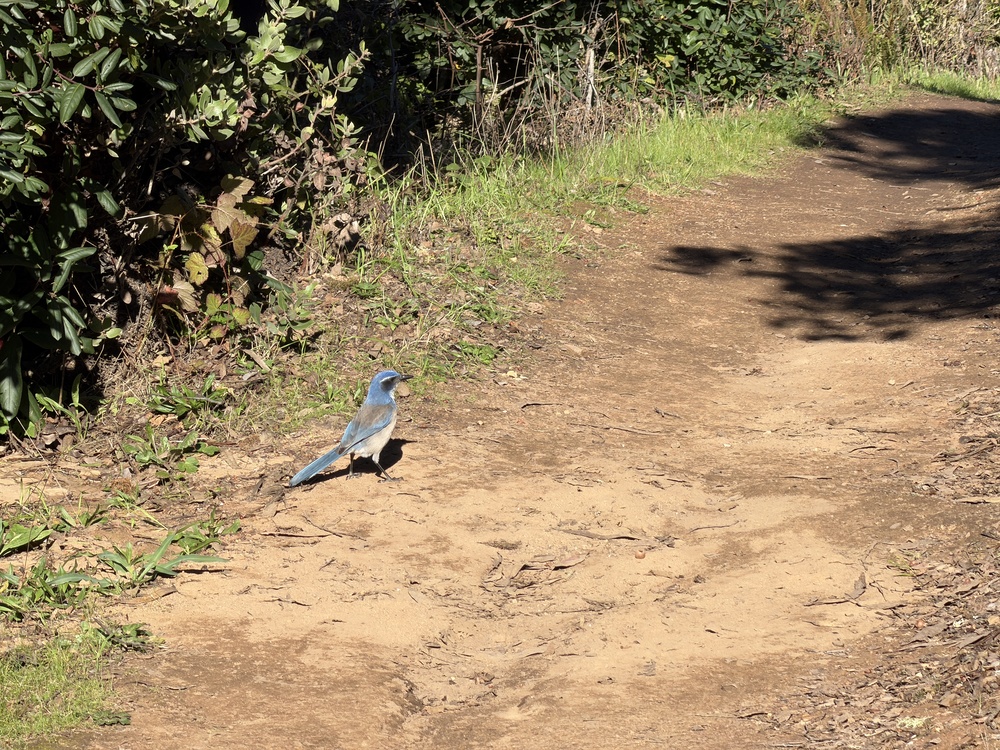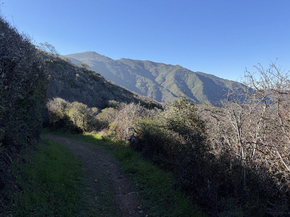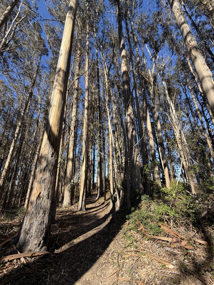 After passing the summit, the trail gently switches back down to the park entrance, leading through a forest of tall eucalyptus trees.