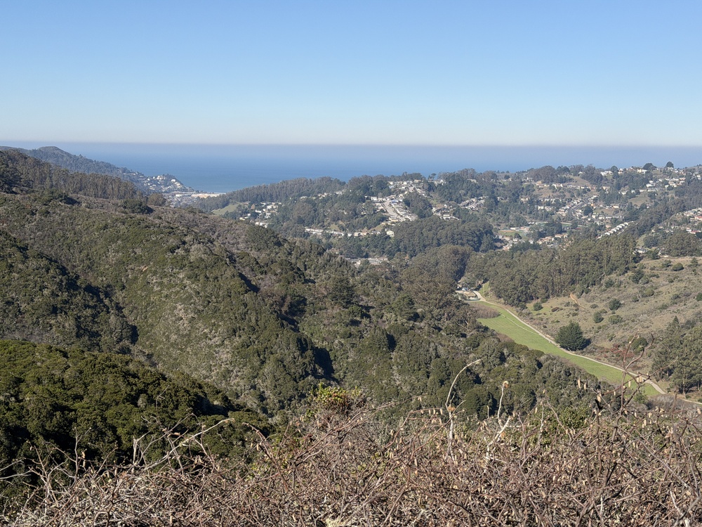 Hazelnut Trail then veers off sharply to the right and leads up the hill on a steep, windy path. On the way up, it offers great views of the park and the ocean at Lindamar Pacifica State Beach.